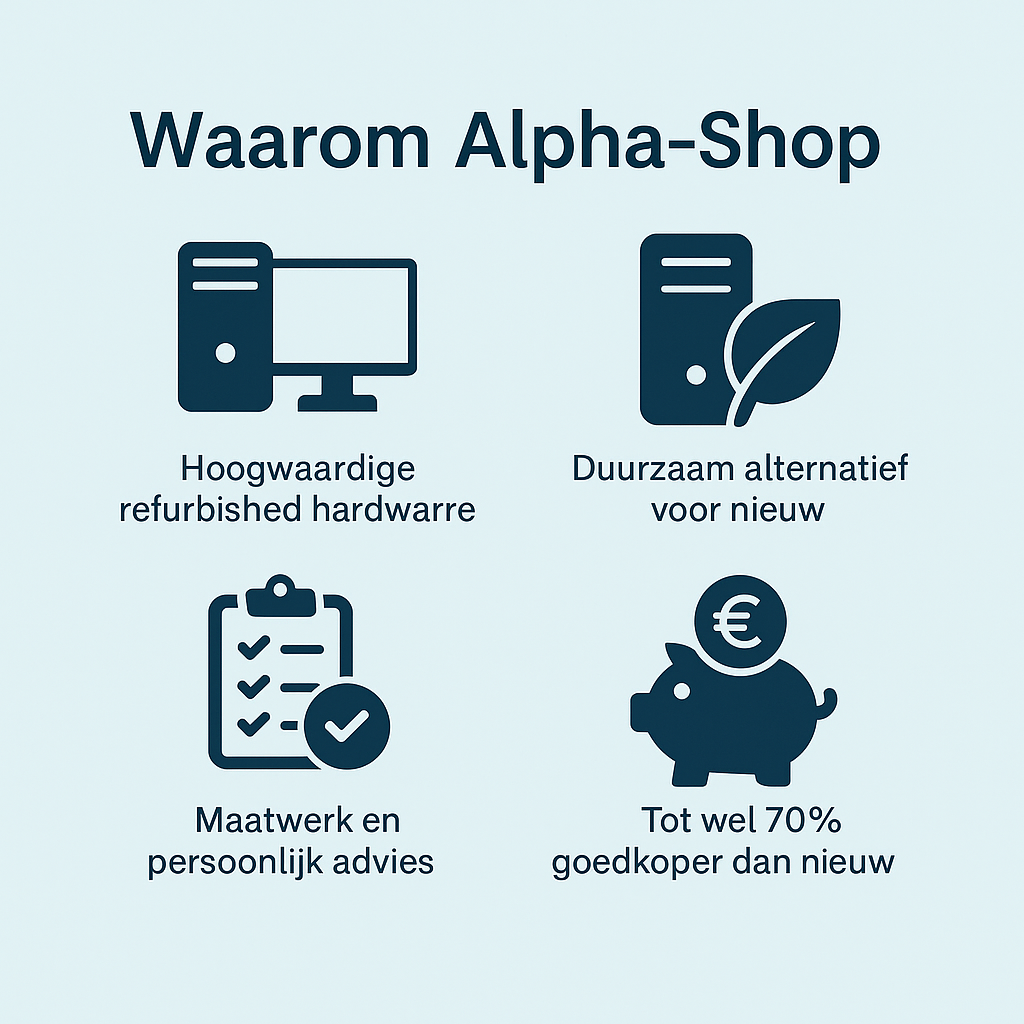 Bij Alpha Shop streven we naar de perfecte balans tussen kwaliteit, betaalbaarheid en duurzaamheid. Wij willen het voor iedereen mogelijk maken om professionele IT-hardware te gebruiken, zonder onnodige kosten of verspilling. Of je nu eenondernemer, thuiswerker, student, zzp’er, onderwijsinstelling of bedrijf bent: wij leveren passende oplossingen die direct inzetbaar zijn en jarenlang meegaan.